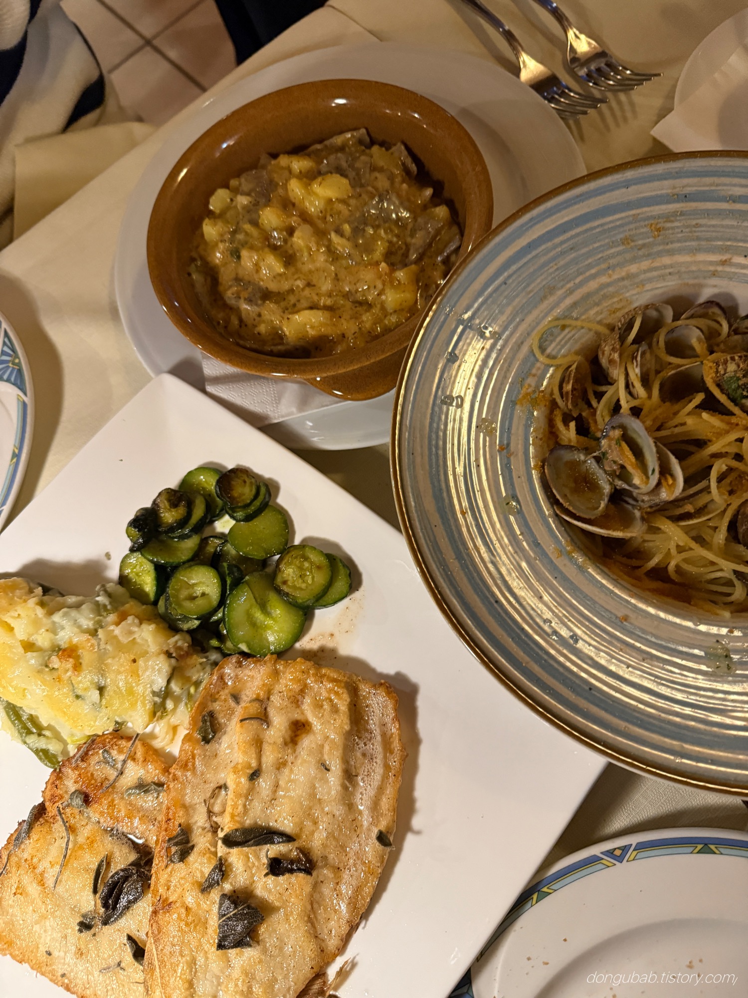 우린 지역 느낌 살려서 생선 요리 + 파스타 + 폴렌타 조합으로 주문.