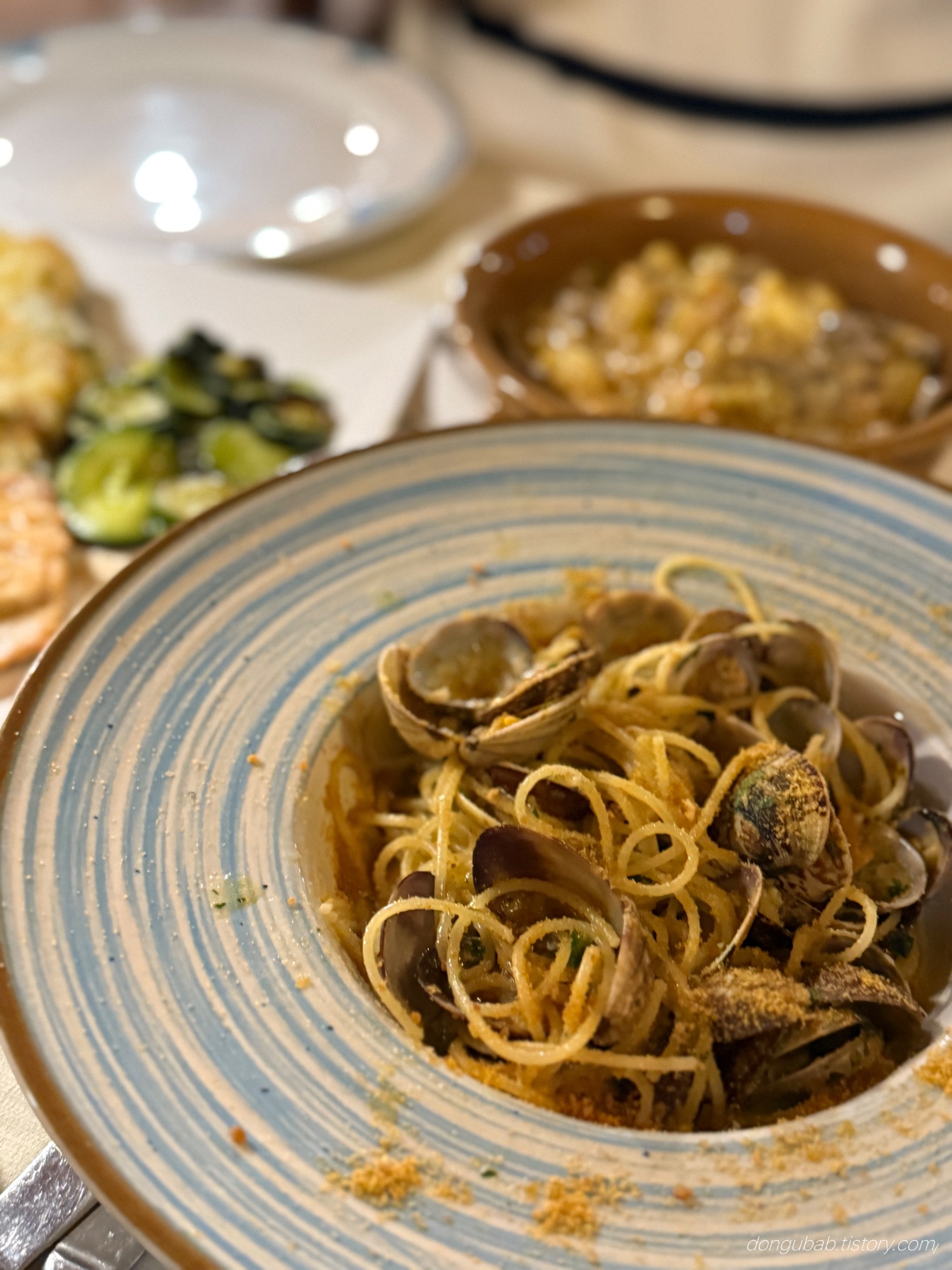 푸른 접시에 올라간 알단테 면과 바지락 조개