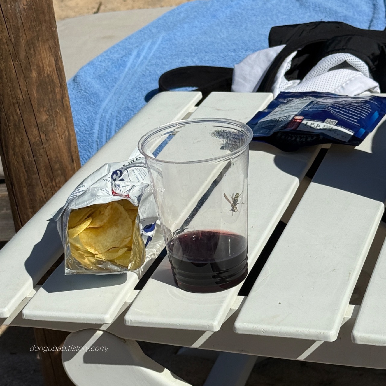 바다에서 수영하고 간간히 먹는 와인과 과자들