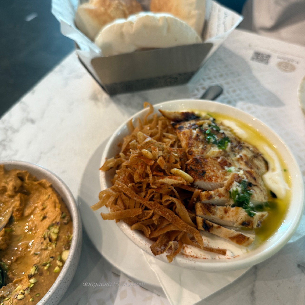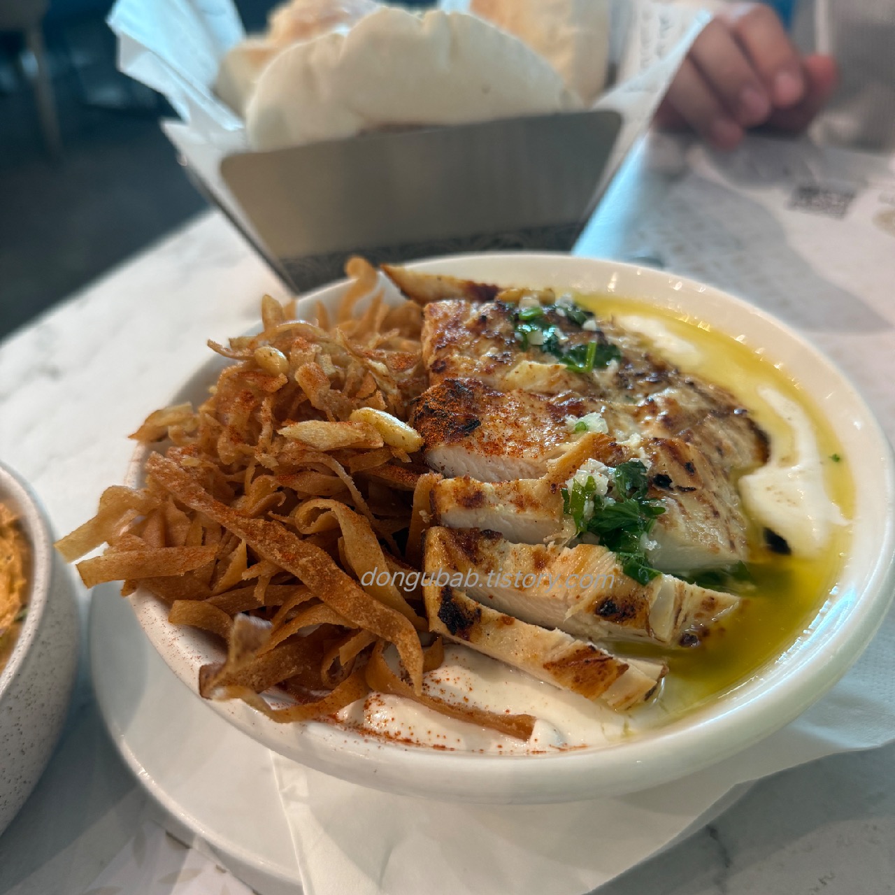 요거트·타히니 소스 위에 구운 치킨과 바삭한 피타칩이 올라간 볼 메뉴.