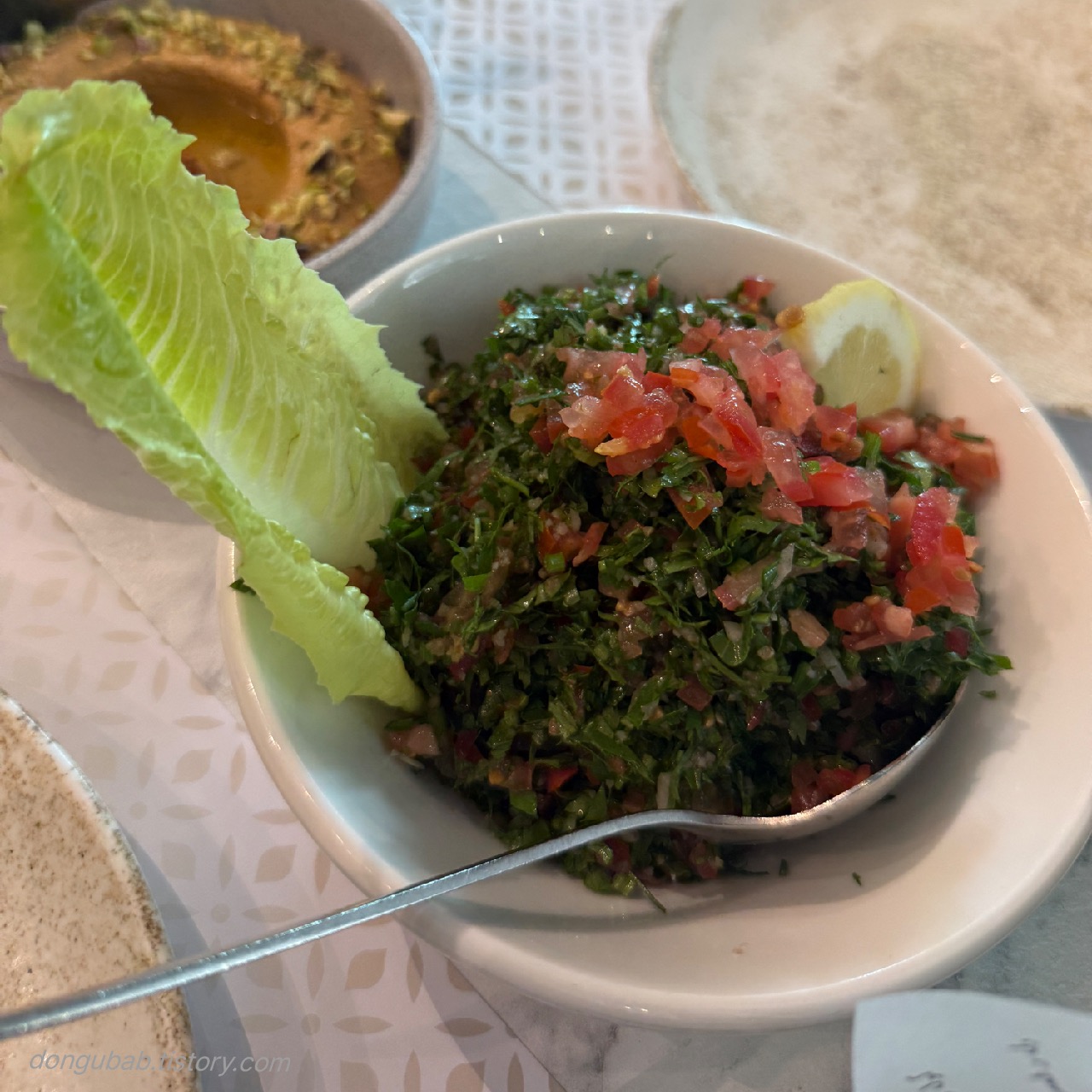 잘게 다진 파슬리·토마토·민트를 레몬·올리브오일로 버무린 샐러드.